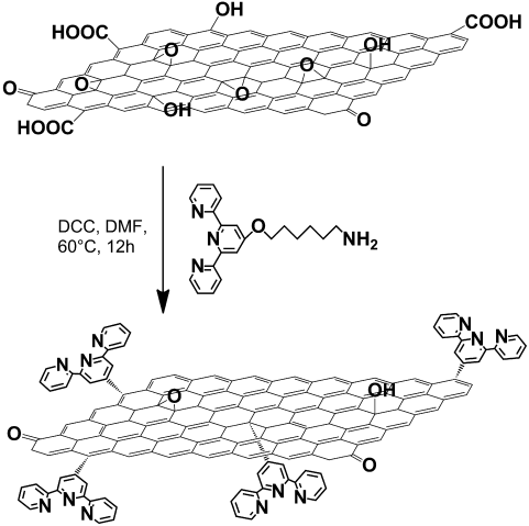 在一般情况下,非官能化的石墨烯是不溶不熔性,这限制了它们的实际应用。课题组博士生宋顺刚通过共价接枝制备了三联吡啶功能化石墨烯氧化物,自组装金属离子(如铁,钌)与石墨烯氧化物呈现3D架构。所得到的电极材料在进行高效的能量转换和存储时可显著改善电活性,在氧还原反应(ORR)、光电转换、超级电容领域具有潜在应用价值。撰写的学术论文“Reversible Self-Assembly of Terpyridine-Functionalized Graphene Oxide for Energy Conversion”发表在Angewandte Chemie Int. Ed.(IF=13.734)期刊。