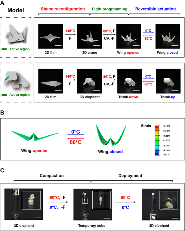 机器人体系中通常包括维持3D形状和实现所需变形两个独立的组成部分。现有的单一材料无法同时满足上述两种要求,因此,在设计机器人体系时多种材料的组合是无法避免的一步。实现无需组装,单一组分的机器人构建将极大的简化机器人的设计思路。本文通过在结晶性聚合物网络中同时引入了热和光两种互不干扰的可逆共价键实现了这一目标。其中,通过热可逆共价键(酯/氨酯键)的热致固态塑性实现三维复杂形状的构建,光可逆共价键(硝基肉桂酸)带来的区域性双向形状记忆行为实现软体机器人特定区域的可逆变形。文中所展示的3D纸鹤和大象为单组分软体机器人的设计提供了新的思路。该项研究工作题名 Programming a crystalline shape memory polymer network with thermo- and photo-reversible bonds toward a single component soft robot, 近期发表在期刊《Science Advances》(Sci. Adv. 2018;4:eaao3865)文章第一作者为博士生金斌杰。