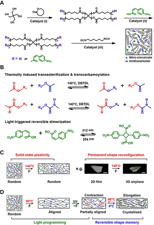 图1:光热双重可逆键聚合物网络的合成与热致塑性与双向形状记忆机理