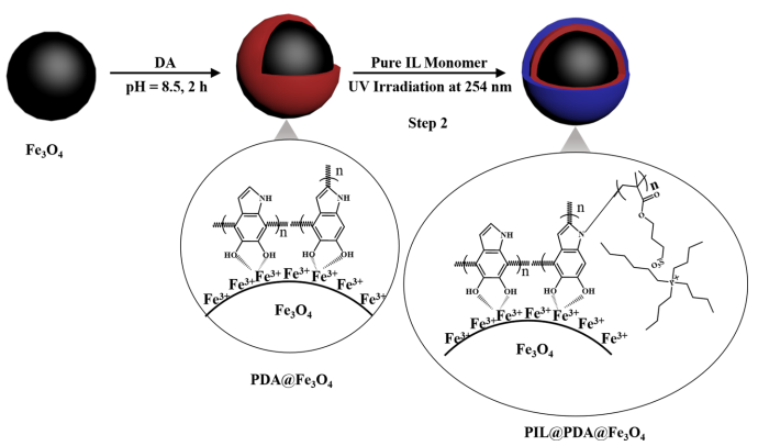 通过自引发、光接枝、光聚合的方式,将聚离子液体直接接枝到聚多巴胺修饰的磁铁粒子上,可以实现水中亚甲基蓝染料的快速回收,同时拥有非常高的吸附容量72.5 mg/g 。