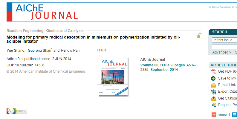课题组尚玥博士的论文Modeling for Primary Radical Desorption in Miniemulsion Polymerization Initiated by Oil-Soluble Initiator.发表在AIChE上