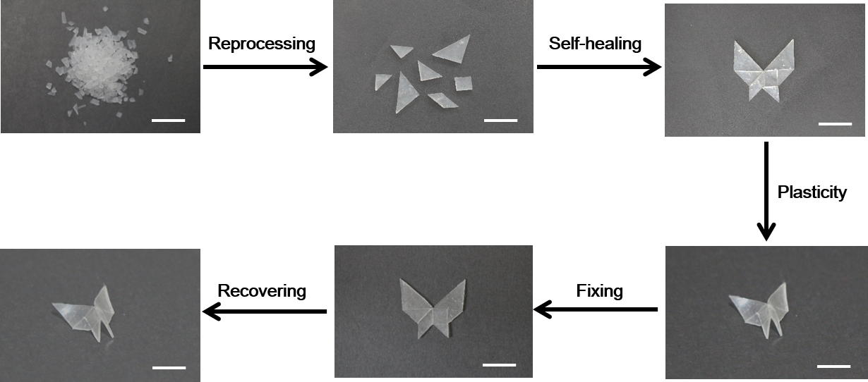 Dynamic covalent polymer networks have received surged interest lately due to their unique properties (self-healing, solid-state plasticity, and reprocessability) not offed by conventional thermosets. Despite the promises, it has been infeasible to tune the temperature required to activate the dynamic network within a particular set of dynamic chemistry. In this work, two sets of dynamic bonds (urethane and hindered urea) are incorporated into a hybrid network for synthesizing shape memory poly(urea-urethane). By changing the bond ratio, networks with highly tunable topological rearrangement kinetics are obtained. Moreover, combining self-healing, solid-state plasticity, and reprocessability in such one shape memory network leads to unusual versatility shape shifting behaviors beyond currently known SMP. This paper titled Healable, Reconfigurable, Reprocessable Thermoset Shape Memory Polymer with Highly Tunable Topological Rearrangement Kinetics was published in ACS Applied Materials and Interfaces (DOI: 10.1021/acsami.7b05713).