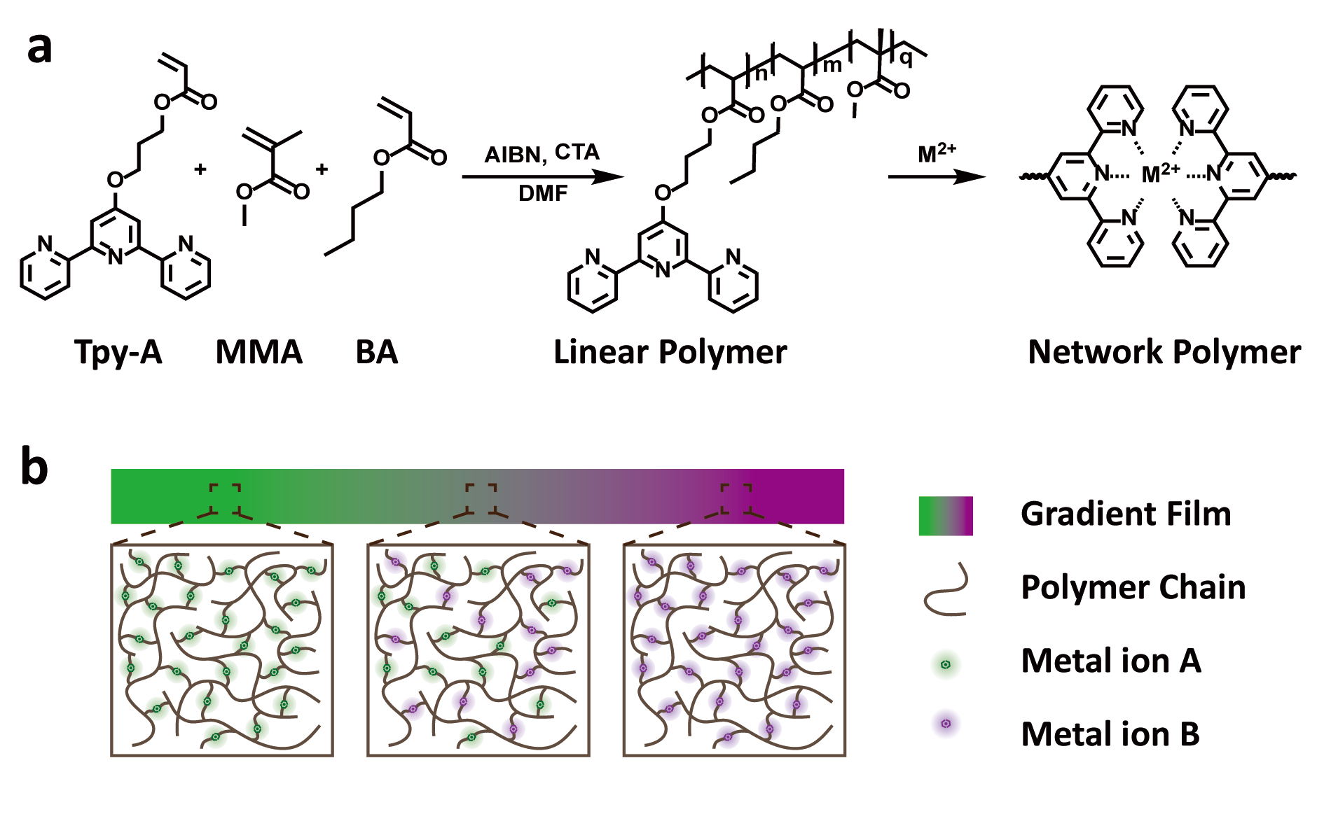 Figure 1. Design of Metallosupramolecular Networks. a) network synthesis. b) spatially gradient network.